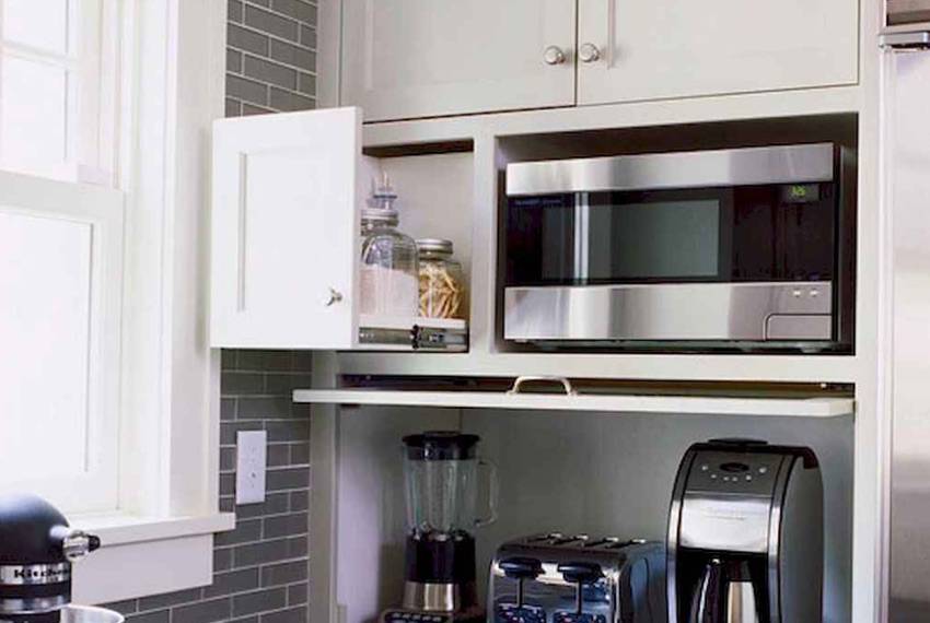 Во многих кухонных гарнитурах есть открытые ниши, которые можно использовать для установки микроволновой печи. Преимуществом данного варианта является эргономичность размещения — электроприбор абсолютно не будет мешать приготовлению пищи и не займет пространство на рабочей поверхности.