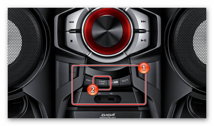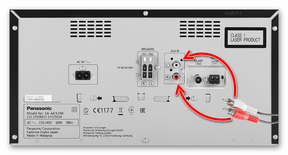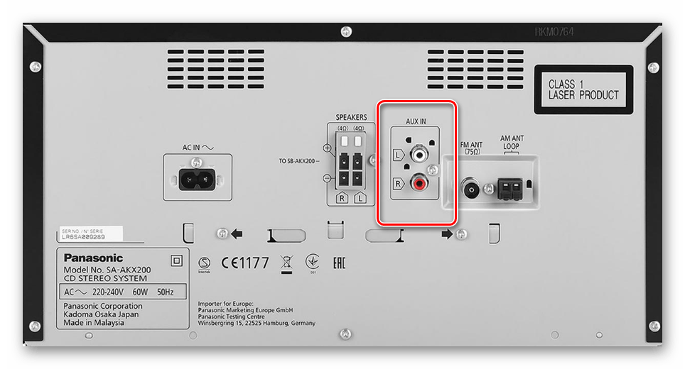 На задней стенке музыкального центра найдите панель с подписью «AUX» или «Line».