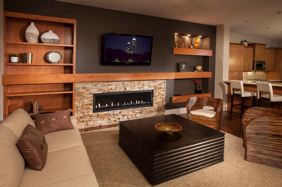 Сложный, но удачный пример совмещения двух акцентов: размещение телевизора с полкой над камином с дверцами, сочетающееся с каменной кладкой нижней части каминного выступа.
