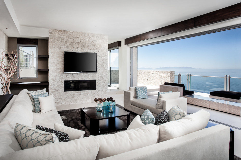 Если в вашем распоряжении оказалось помещение с камином, хорошей идеей будет разместить ТВ над ним — как ни крути, а камин будет притягивать взгляды, так почему бы не совместить его с ТВ-зоной?