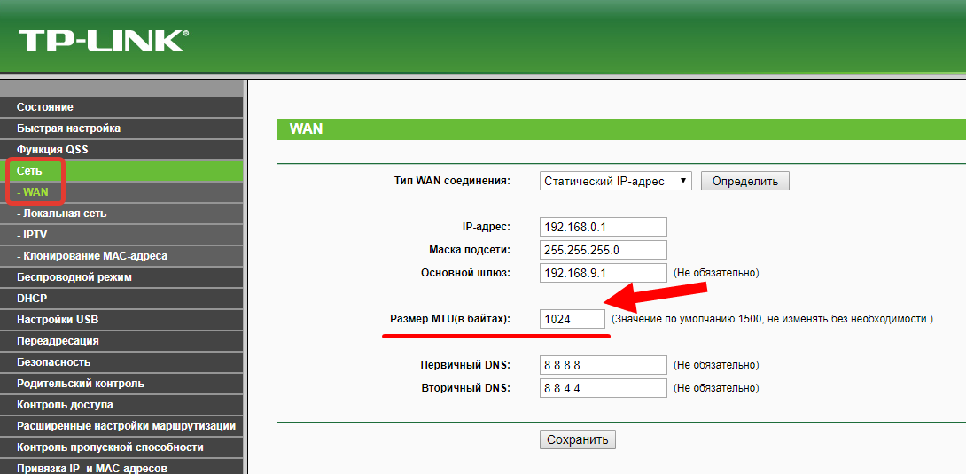 В роутерах TP-Link перейдите на вкладку Network – WAN и укажите нужное значение в поле MTU Size (кстати MTU указывается в байтах)