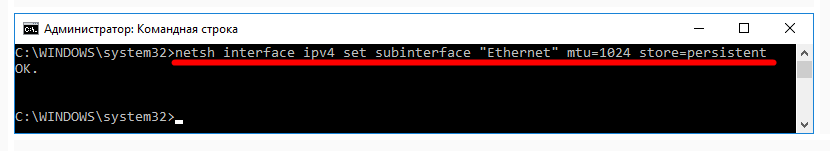 Для этого введите команду «netsh interface ipv4 set subinterface “Ethernet” mtu=1024 store=persistent», где укажите то же число, что и ранее в настройках роутера.