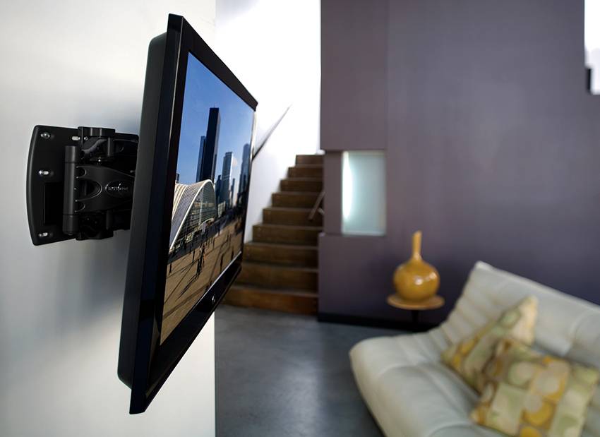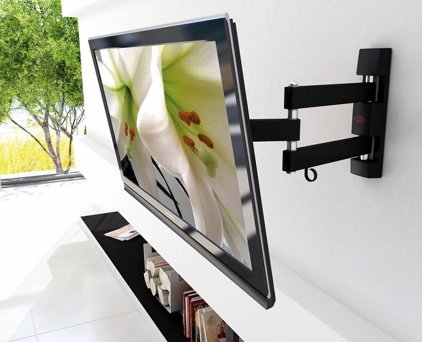 Полезный совет! Когда возникает вопрос, как повесить телевизор в углу, на помощь приходит именно универсальный кронштейн.