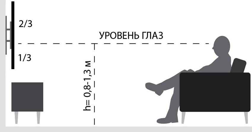 На уровне глаз сидящего зрителя должна располагаться центральная точка дисплея, которая располагается на уровне трети от низа телевизора.