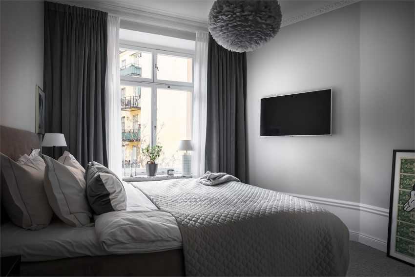 Слишком большой телевизор может визуально «съедать» пространство, раздражать глаза. Особенно если спальня небольшая по площади. А маленький экран заставит напрягать зрение, чтобы рассмотреть подробности происходящего на экране