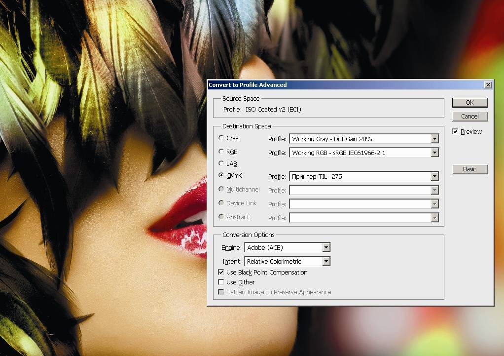 Первым шагом, средствами Adobe Photoshop(TM) выполняем преобразование цвета,с учетом общего снижения насыщенности (TIL). В этом случае, для преобразования используется ICC профиль принтера, имеющий TIL = 275%.