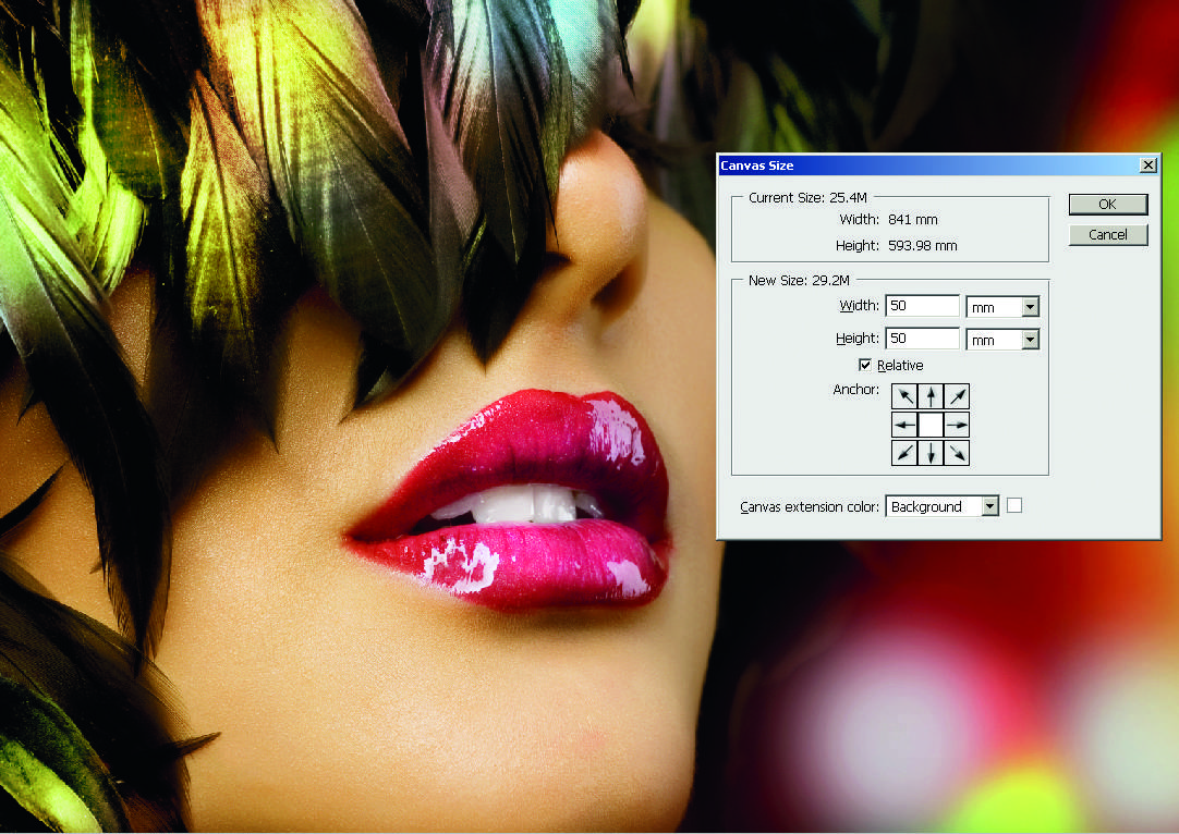 Следующим шагом в программе Adobe Photoshop(TM) изменяем размер поля изображения и, выполнив команду Canvas Size, добавим требуемые поля изображения.
