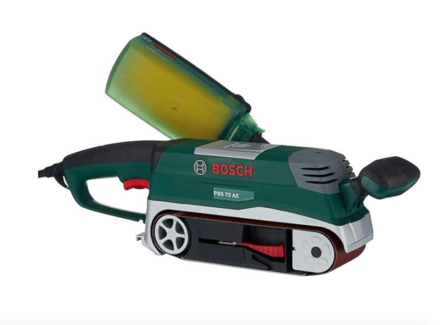 Bosch PBS 75 AE – надежный и достаточно мощный инструмент, который с удовольствием используют не только любители, но и профессионалы. Несмотря на средний уровень мощности (750 Вт), данная модель отличается отличной производительностью. Использование алюминия позволило снизить машины вес до 3,5 кг. Размеры ленты 75×533 мм. У этой шлифмашины есть контейнер для сбора пыли с системой микрофильтрации, кроме того, к машине можно подключать пылесос. Также в список возможностей этого инструмента входит регулировка скорости, системы центрирования ленты и ее быстрой смены.