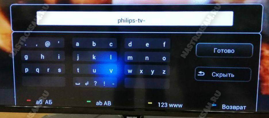 Здесь с помощью экранной клавиатуры вводим сетевое имя для ТВ и нажимаем кнопку «Готово».