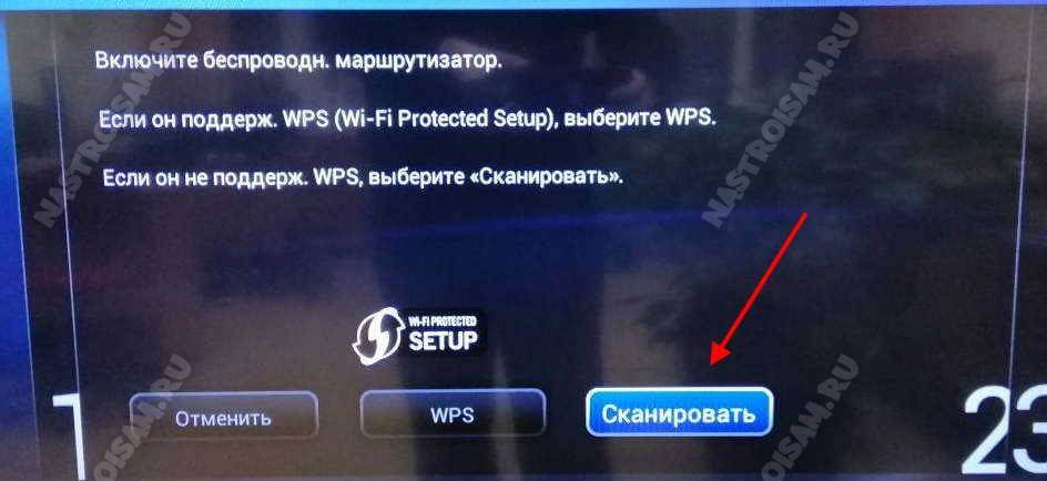 Потом устройство предложит как будем искать сеть роутера — через WPS или будем сканировать эфир. Лично предпочитаю не пользоваться WPS и потому будем искать свой Вай-Фай самостоятельно — нажимаем кнопку «Сканировать».