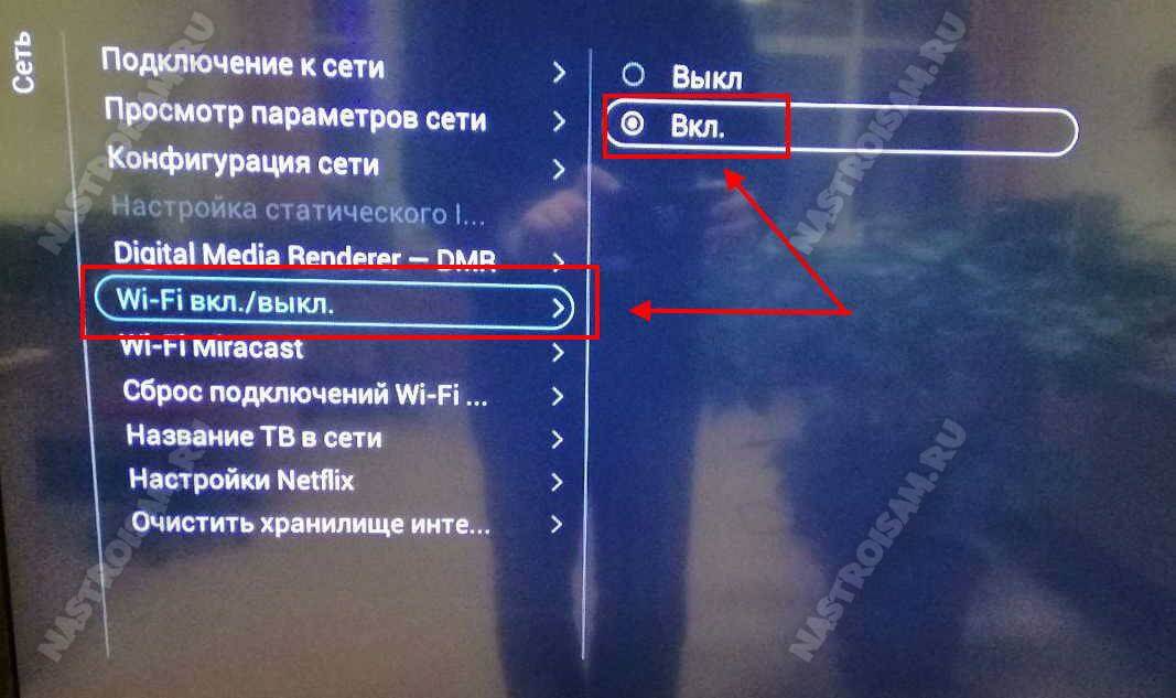 В моём случае беспроводной адаптер телевизора был изначально отключен и потому его надо сначала включить, зайдя в подраздел «Wi-Fi вкл./выкл.» и выбрать значение «Вкл».