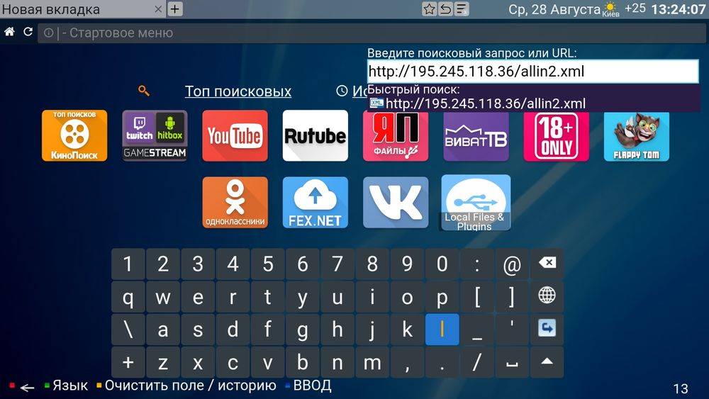 Вводить её нужно на главной странице плеера в строку «Введите поисковый запрос или URL-адрес сайта, плейлиста XML / M3U»