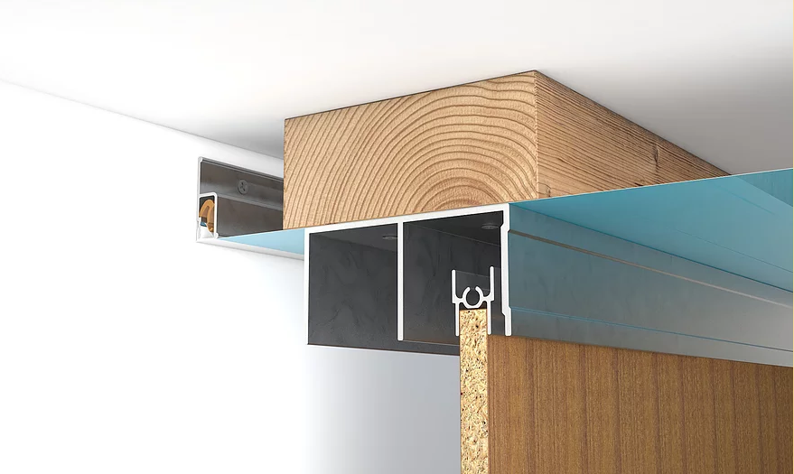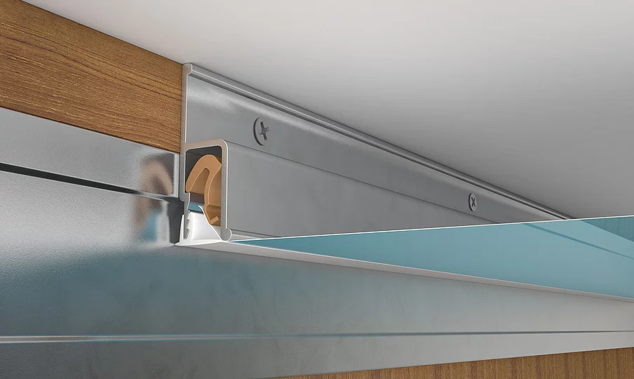 Если направляющие дверей прикреплены непосредственно к плите, закладная закрепляется перед ними и скрывает верхнюю часть мебели.