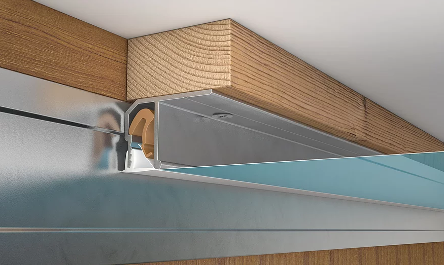 Для достаточно декоративных потолочных полотен значительных размеров прочности доборной планки или фальш-панели зачастую уже не хватает, чтобы надежно удерживать полихлорвиниловую ткань в растянутом состоянии. В этом случае для решения проблемы приходится использовать специальную деталь — брус или деревянную закладную рейку для шкафа-купе в натяжном потолке.