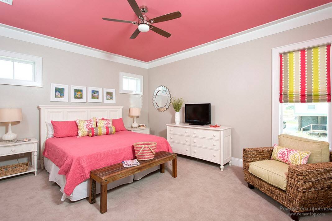 Потолок в спальной комнате можно просто покрасить в белый цвет или подобрать пастельные тона подходящей гаммы.