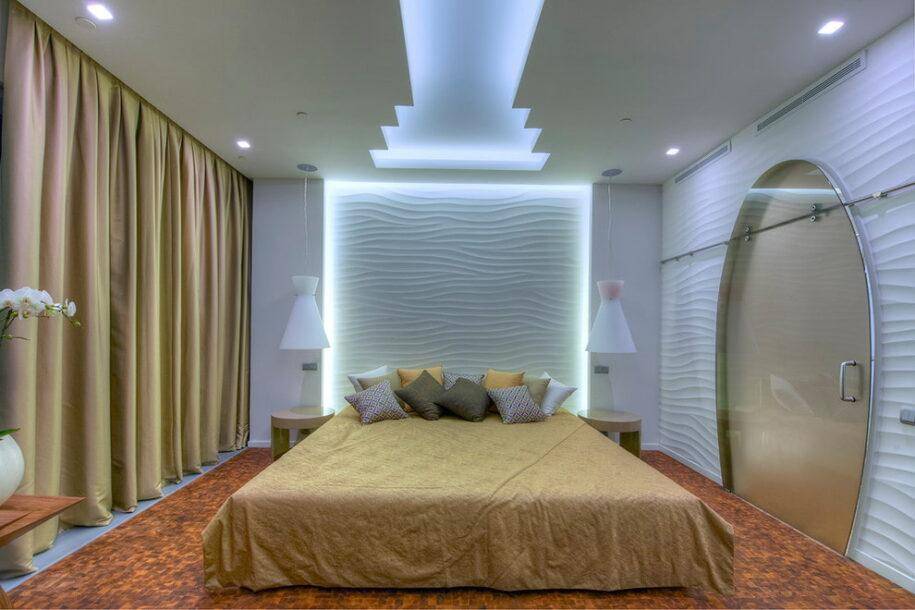 Многоуровневые конструкции (с тремя и более плоскостями) уместны в очень просторных спальнях.