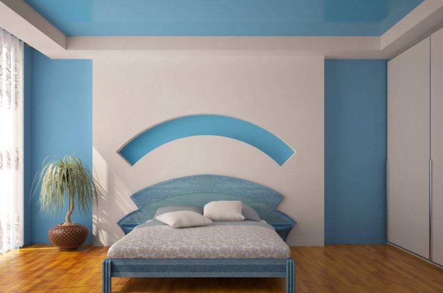 Если потолок в спальне имеет небесно – голубой тон, то ее стены можно окрасить в такие цвета как светло-желтый, приглушенно-зеленый или бледно-розовый.