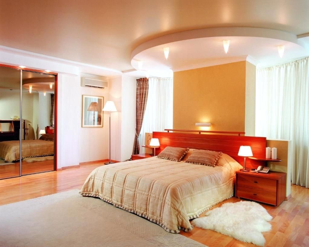 Выбор цвета также во многом зависит от расположения помещения. Если окна спальни выходят на северную сторону, то в ней рекомендуется использовать потолочные покрытия, имеющие светлые и достаточно яркие тона. Компенсировать недостаток естественного света помогут солнечно-желтые или оранжевые потолки, которые придадут помещению более теплый и уютный вид.