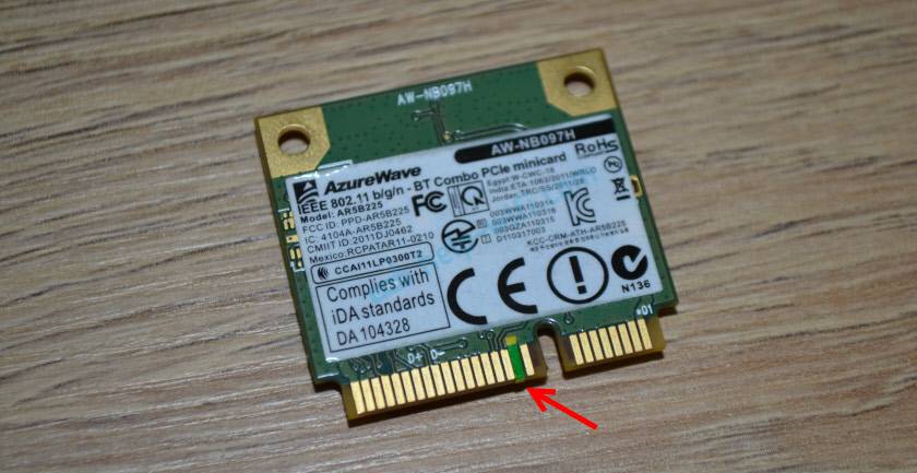 На Wi-Fi модуле, который подключается в разъем Mini PCI-e нужно заклеить 20 контакт. Но 20-тый он не по счету (по счету получается 17), а потому, что такой номер он имеет на схеме этой платы.
