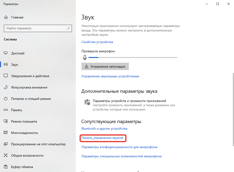 - В новом окне пролистать страницу до низа, перейти по гиперссылке «Панель управления звуком».