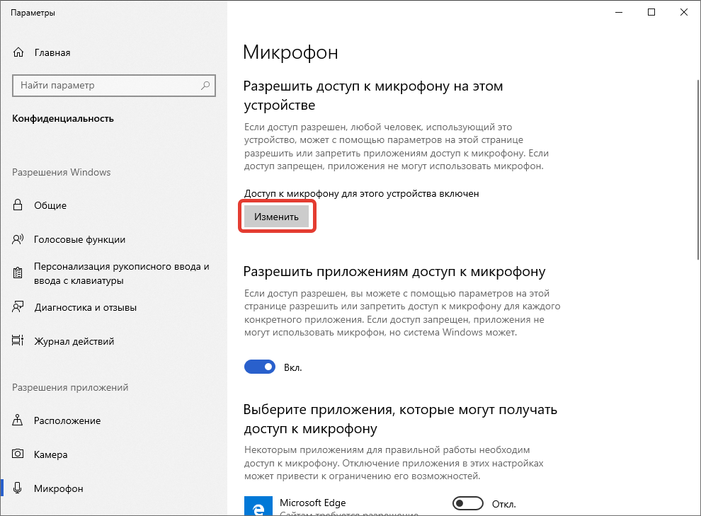 - В блоке «Разрешить доступ к микрофону на этом устройстве» нажать по кнопке Изменить и выбрать параметр «Вкл».