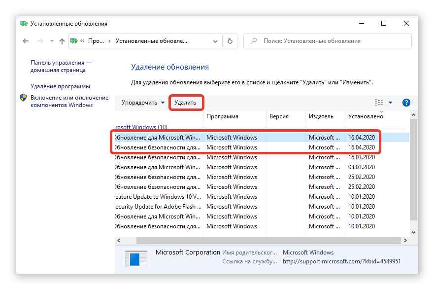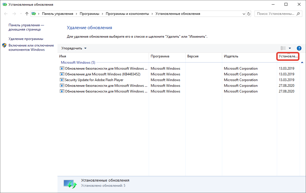 - Отсортировать список апдейтов по столбику «Установлено», выделить последний, нажать кнопку Удалить.
