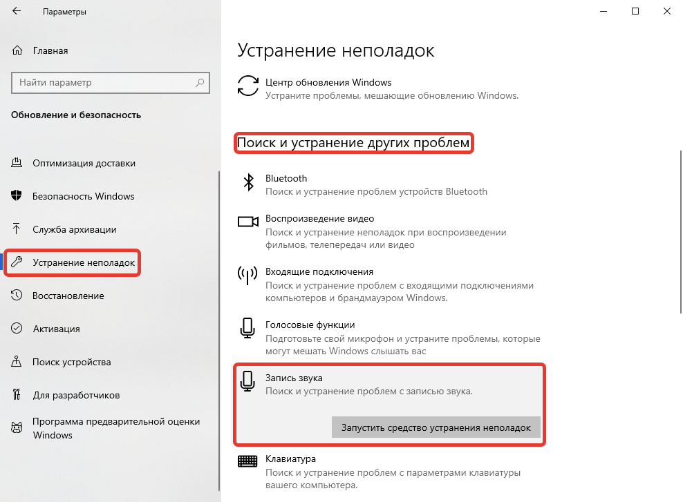 - Открыть вкладку «Устранение неполадок» и в блоке «Поиск и устранение других проблем» кликнуть по «Запись звука».