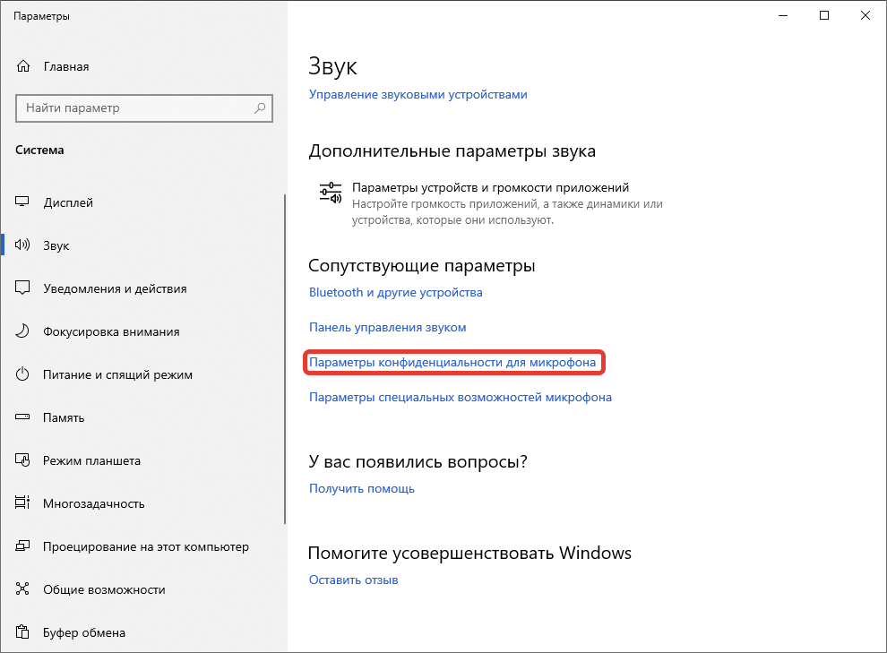 - В нижней части страницы перейти по гиперссылке «Параметры конфиденциальности для микрофона».