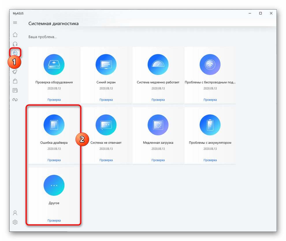 Для всех обладателей ноутбуков ASUS с Windows 10 компания разработала фирменное программное обеспечение, являющее собой что-то вроде центра управления девайсом. Здесь в разделе с диагностикой есть плитка «Ошибка драйвера» — попробуйте запустить этот инструмент для поиска нерабочего программного обеспечения, связанного с тачпадом. Если это не помогло, воспользуйтесь плиткой «Другое» для поиска дополнительной информации или обращения к службе поддержки.