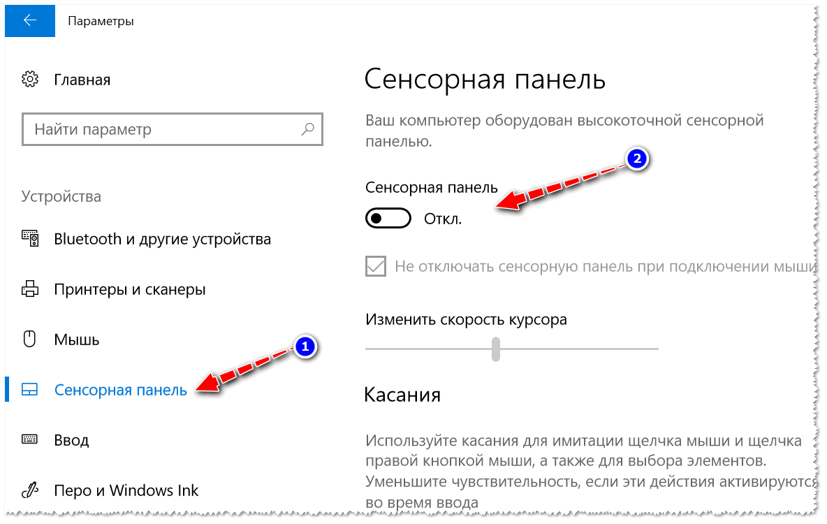 Если у вас установлена ОС Windows 10 — обязательно откройте ее параметры (сочетание кнопок Win+i) и перепроверьте вкладку «Устройства/Сенсорная панель» .