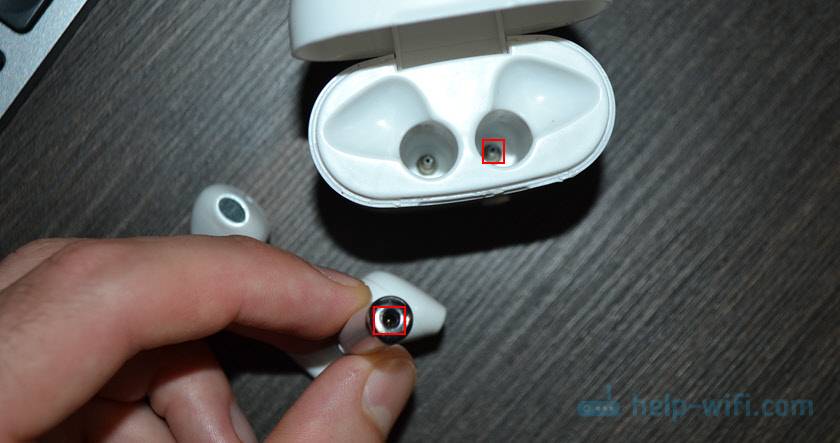 На каждом наушнике есть как минимум по 2 контакта. Такие же контакты есть в кейсе, куда устанавливается наушник. Если эти контакты загрязнились, или повредились, не будет соединения между наушником и кейсом. Соответственно он не будет заряжаться и отключаться от телефона. На новых наушниках (с завода), не редко, эти контакты заклеены тонкой пленкой, которую даже заметить сложно.