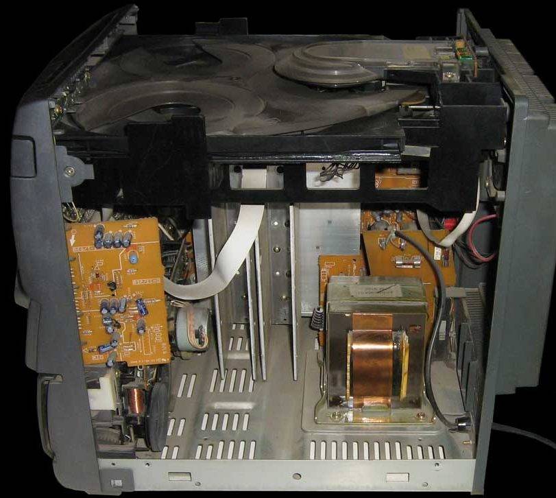 Многие не представляют прибор, отказывающийся проигрывать кассеты. Дек чаще две, работают на воспроизведение попеременно, контролируется механически. На уровне схемы происходит переключение усилителя на нужную головку. Лентопротяжный механизм одним мотором, тянет ленту, бобины чуть подпружинены. Тракты записи-воспроизведения раздельные, можно писать: