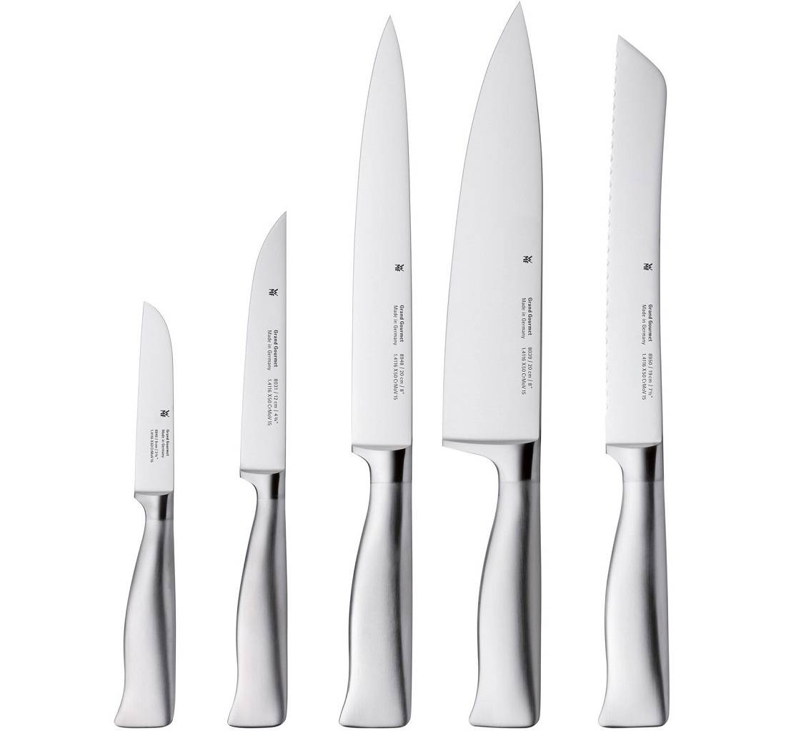 Наборы от немецкого производителя посуды Württembergische Metallwarenfabrik (сокращенно WMF) имеют разную комплектацию и стоимость. В продаже есть варианты всего из 2 единиц (например, шеф-нож и точилка для ножей или универсальный нож и сантоку). Представлены и наборы из 5, 6, 7 и даже 8 ножей, с подставкой или без.
