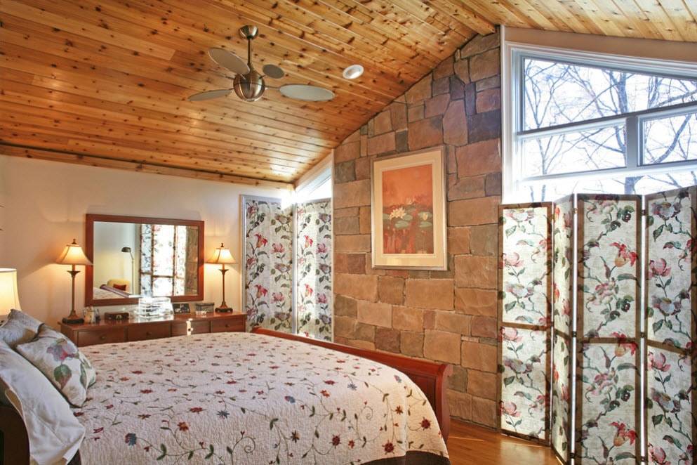 Кроме того плотной шторой можно эффективно разделить большое пространство в небольшом деревянном доме.
