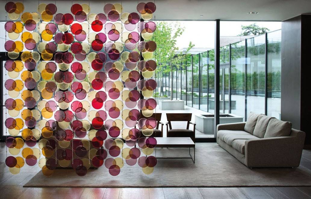 Также в продаже имеются специальные дизайнерские ширмы, что представляют собой целый арт-объект, изготовленный из стеклянных дисков, металлических кругов или других практичных материалов. В большинстве случаев такие перегородки используются как украшение, заполняющее пустой угол комнаты. Для большей практичности на ней устанавливают полочки, на которые можно выставить различные декоративные вещи или же фотографии.