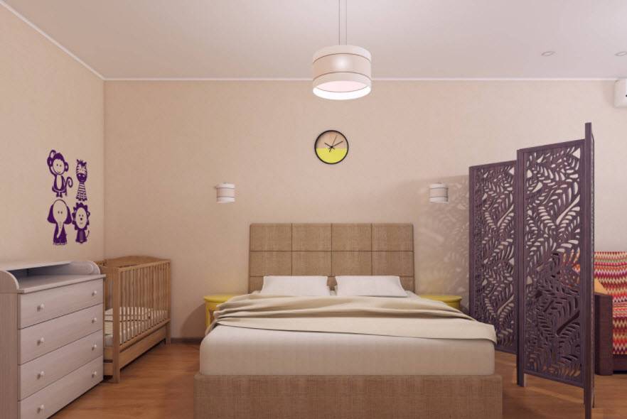 - Комнату на две зоны лучше всего разделит однотонное полотно или простая конструкция с незатейливыми рисунками.