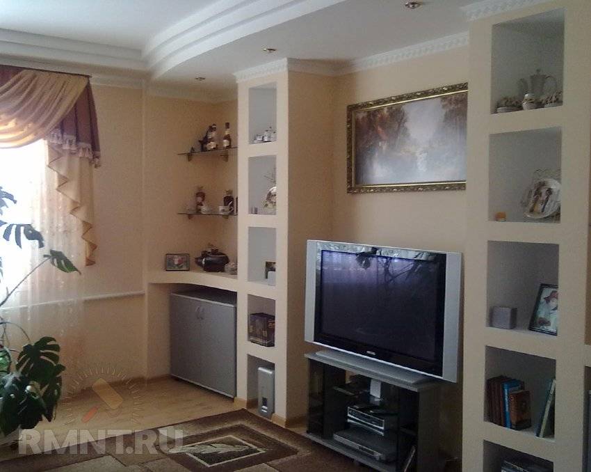 - Полномасштабная гипсокартонная конструкция с несколькими нишами на стене пригодится не только для телевизора, но и для хранения различных сувениров, статуэток, комнатных растений и другого декора;