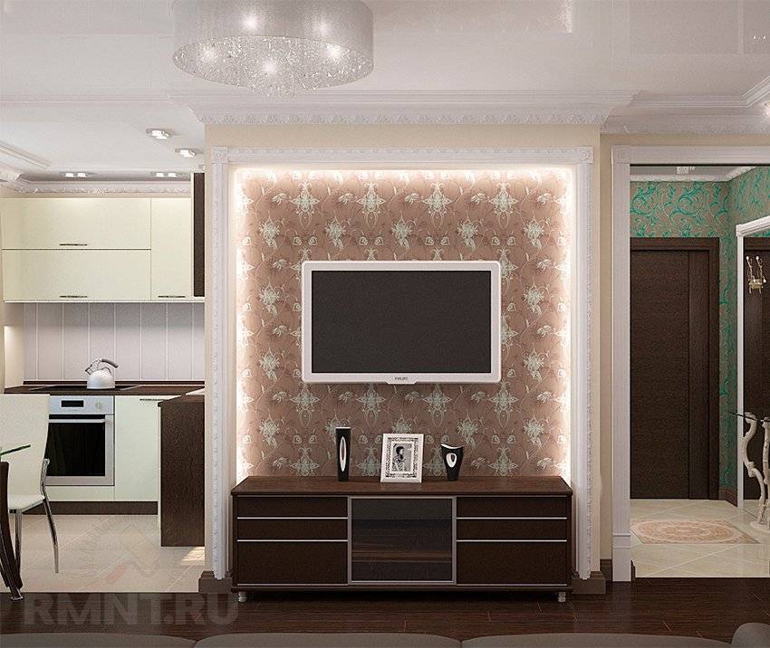 Ниша под телевизор в гостиной должна быть интересной. Возможно, применение водоэмульсионной краской, обоев, тканей и различных декоративных плиток и лепнины. Главное, чтобы стенка не конфликтовала, а дополняла интерьер гостиной комнаты.