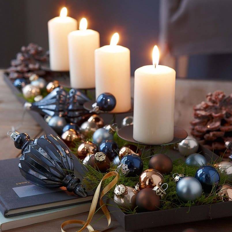 Ароматические свечи, украшенные ёлочными игрушками послужат хорошим дополнением новогоднего стола