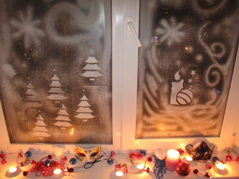 Зимой нередко можно увидеть на стекле узоры, нарисованные морозом. Они притягивают взгляд загадочными переплетениями линий. Также и вы можете сделать самостоятельно удивительные рисунки. Для этого используется трафарет, специальные краски, сахарная пудра, искусственный снег из баллона либо обычная зубная паста. Идеи картинок подскажет фантазия: снежок, падающий на деревья и дома, отпечатки ладошек членов семьи, Дед Мороз со Снеговичком, лесные зверята. Интересно смотрится гармоничное сочетание рисунков и бумажных поделок.