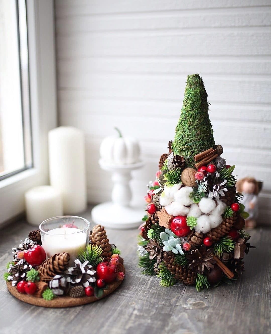 В тех случаях, когда не хочется тратить средства на новогодний декор, отличным решением станет использовать природные материалы. Из них могут получиться довольно необычные композиции.