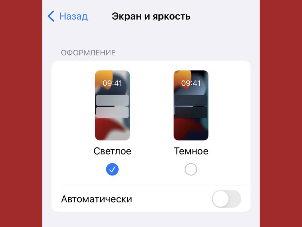 «Оформление» даёт возможность переключаться между светлым и тёмным интерфейсом системы и приложений, а также установить автоматическое переключение.