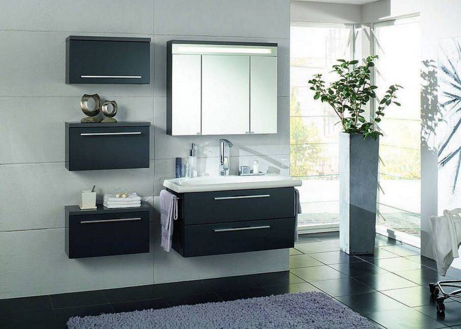 - Навесные раковины с тумбой или шкафчиком, в которых удобно хранить моющие средства и другие предметы. Этот вариант подходит для больших и средних по размерам ванных комнат.