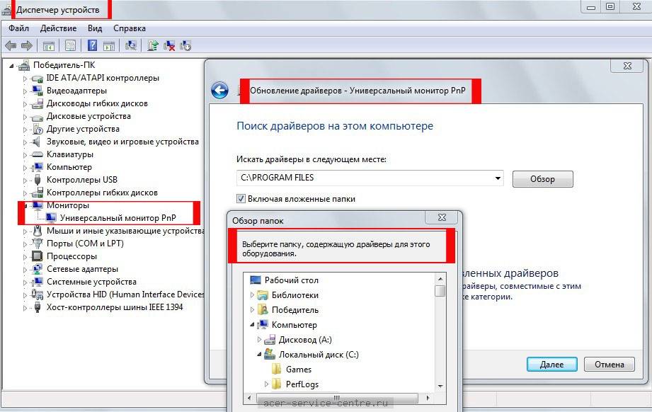 Далее запускаем диспетчер устройств и выбираем свой дисплей из предложенного списка оборудования. Щелкаем на нем правой мышкой, и в появившемся окне выбираем «Обновить драйверы». В новом же окошке задаем вот такой параметр — «Установить из указанного места». Затем указываем папку, в которой находятся распакованные драйверы.