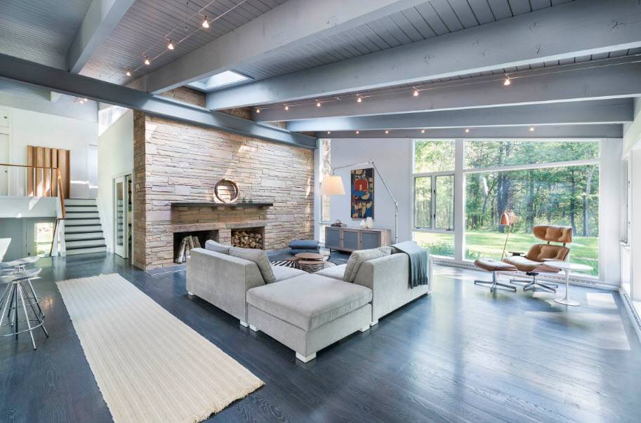 Покрытие под бетон, камень или гранит зрительно увеличивает комнату. Панель с глубоким рельефом красиво смотрится в бежевом, нежно-коричневом или холодном сером цвете. Ламинат гармонирует с белыми и темными оттенками мебели. На теплом полу не видны разводы и пыль.