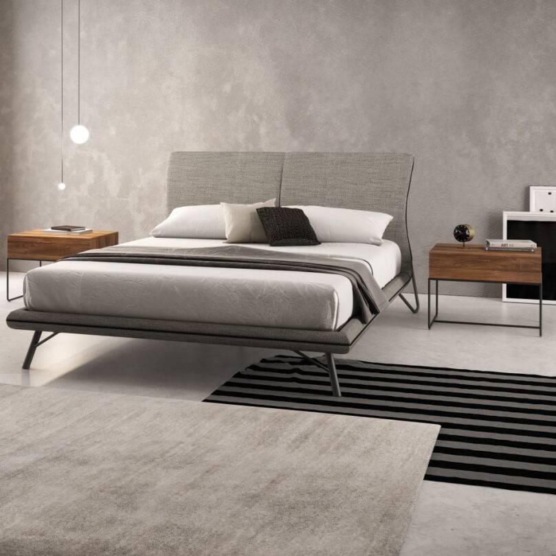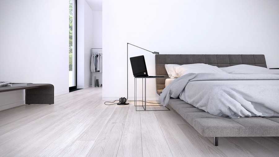 Светло-серый наливной пол в спальне и «парящая» кровать