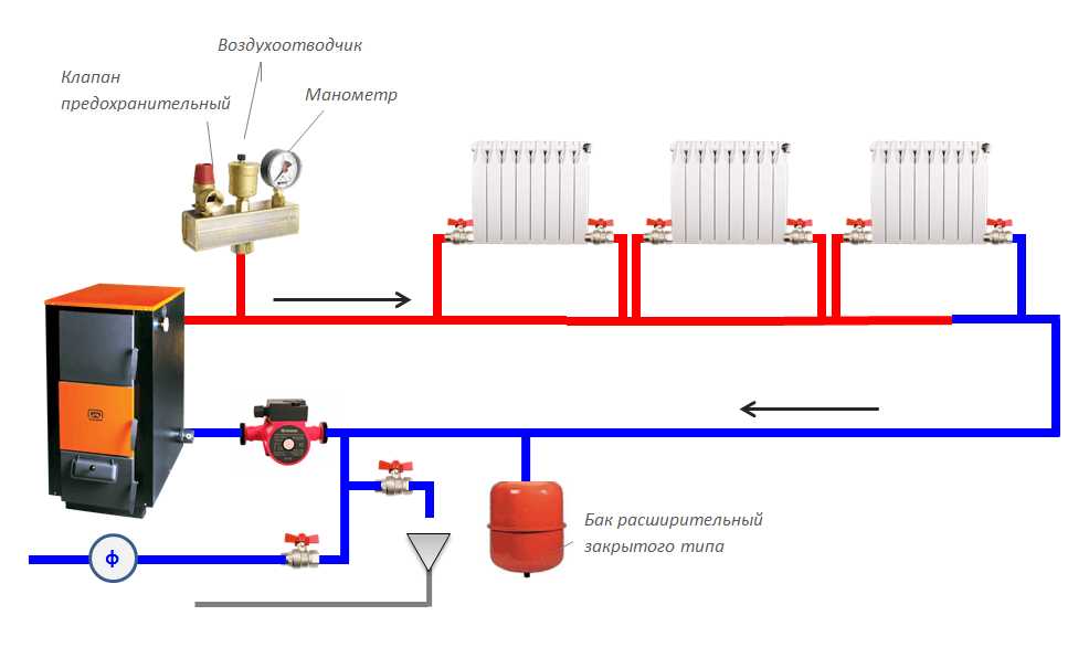 Если система отопления является закрытой, то в нее вместо обычного открытого расширительного бака устанавливается герметичный мембранный. Это позволяет обеспечивать заданное избыточное давление ( обычно оно составляет около 1,5 бар (0,15 МПа). Кроме того, такая схема должна обязательно включать блок безопасности (предохранительный клапан, манометр, воздушный клапан).