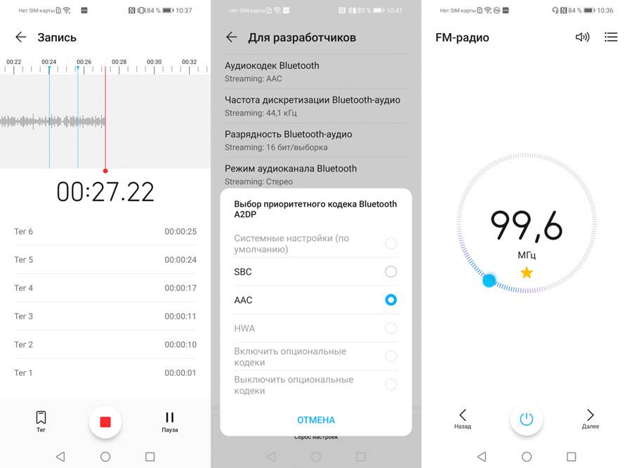 Программа “Диктофон” пишет разговоры в файлы формата M4A, маркируя при необходимости эти записи тегами. Среди доступных Bluetooth-кодеков для беспроводных наушников числятся SBC, AAC и HWA. А вот у FM-тюнера (с возможностью планового отключения через 10, 20, 30, 60 или 90 минут) коротковолновая антенна встроенная, поэтому проводная аудио-гарнитура подключается только для улучшения приема. Слушать радио можно не только через проводные наушники, но и через “мультимедийный” динамик, а также подключенное по Bluetooth аудиоустройство.