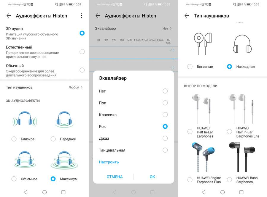 Набор аудиоэффектов Histen, как обычно, доступен только при подключении проводных наушников. Здесь наряду с имитацией глубокого объемного 3D-звучания (“близкое”, “переднее”, “объемное”, “максимум”), предлагаются также естественный и обычный режимы. В последнем случае появляется доступ к 10-полосному эквалайзеру с усилением басов, пятью пресетами и индивидуальной настройкой, а также возможность отметить тип подключаемых наушников.