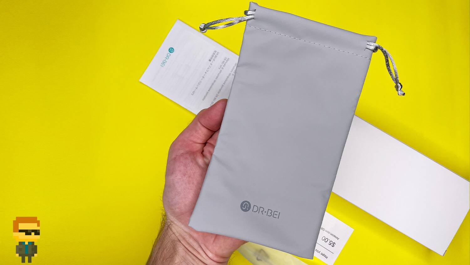 Чехол из приятного на ощупь светло-серого материала в стиле софт-тач. Более темным оттенком нанесен логотип Dr.Bei.